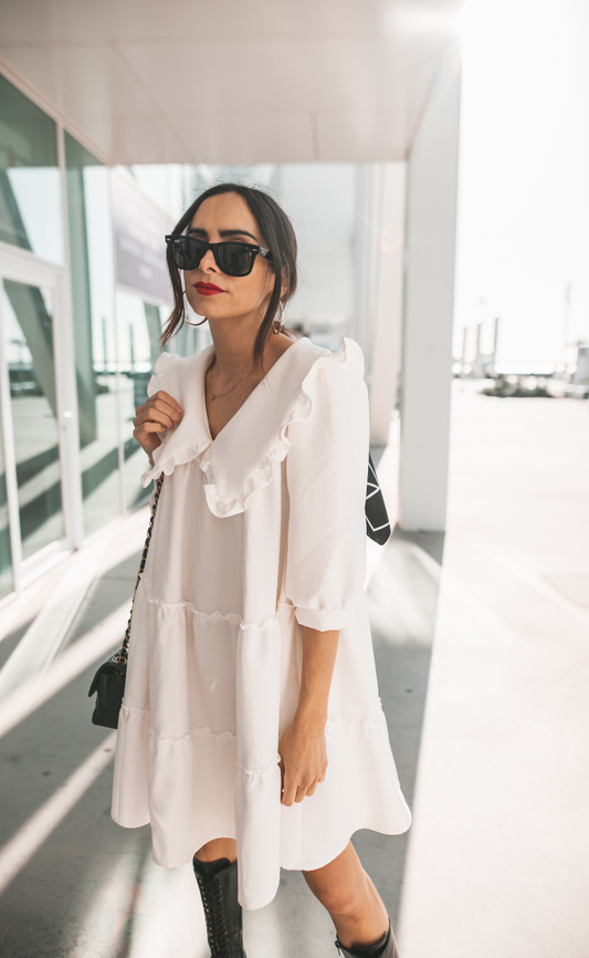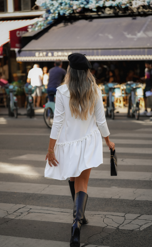 Vestido curto, decote em bico com gola peter pan. Folho na extremidade inferior assimétrico frente/costas. Manga abalonada com punho alto.