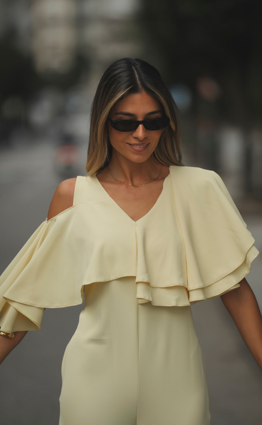 A parte superior deste macacão ajusta-se perfeitamente ao corpo, realçando a silhueta, enquanto o decote em V alonga e valoriza o tronco. A cintura é acentuada por um peplum estruturado, adicionando volume. As calças são de corte afunilado e comprimento cropped. Para um detalhe extra de conforto e praticidade, o modelo inclui bolsos. Fecho oculto nas costas.
