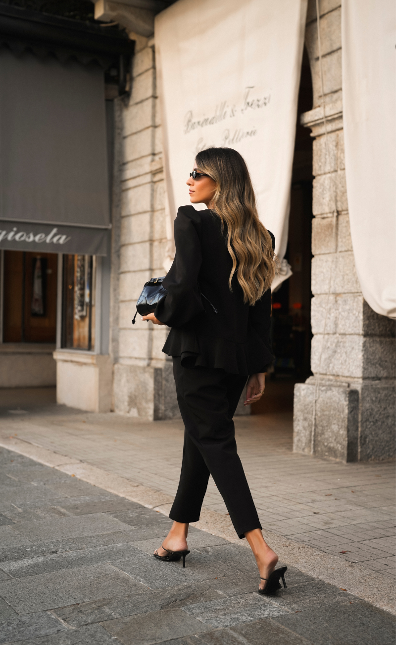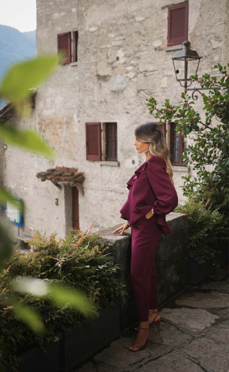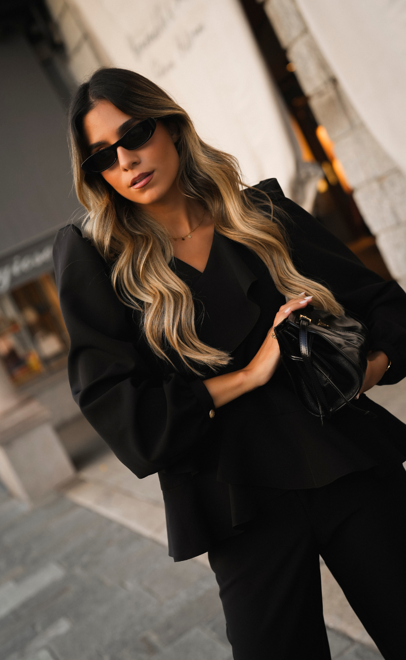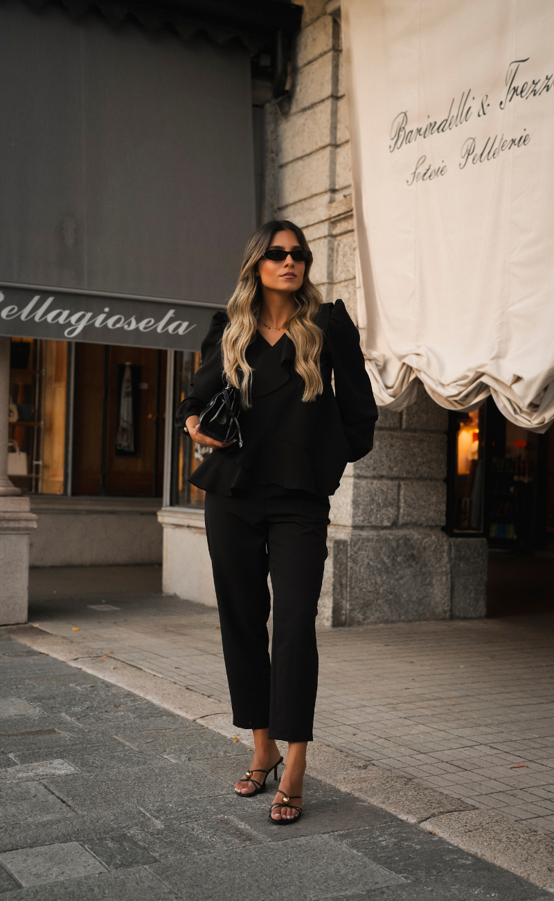 Blusa com decote de bico pormenor de folho assimétrico. Manga comprida abalonada.