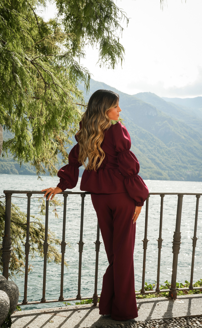 Blusa com decote de bico, folho duplo na extremidade inferior. Manga balão. Fecho oculto na lateral.