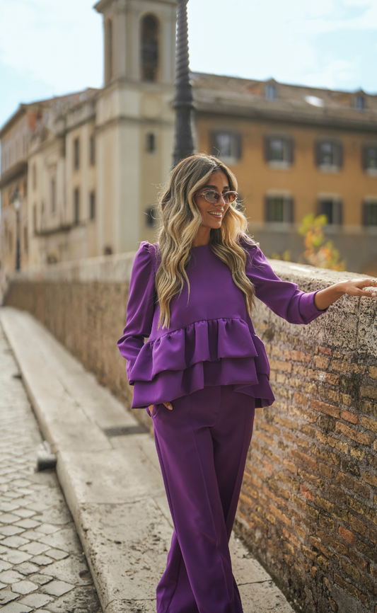 Blusa com gola dupla tipo holandesa. Manga dupla abalonada. Folho na extremidade inferior. Abertura frontal com botões.