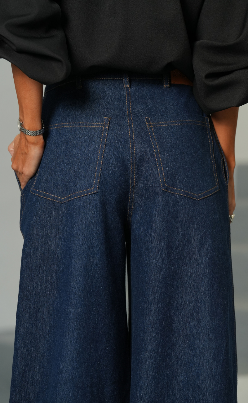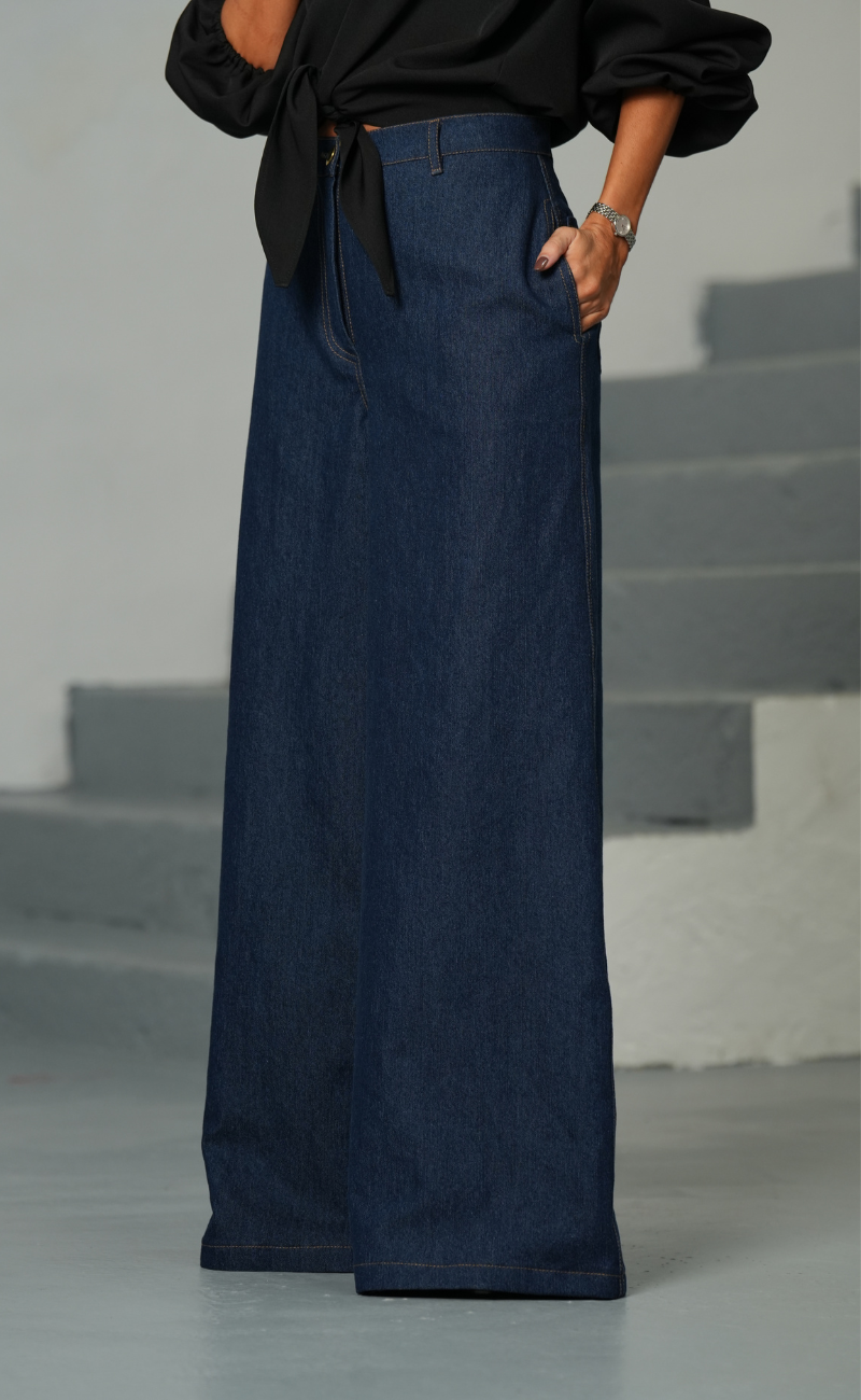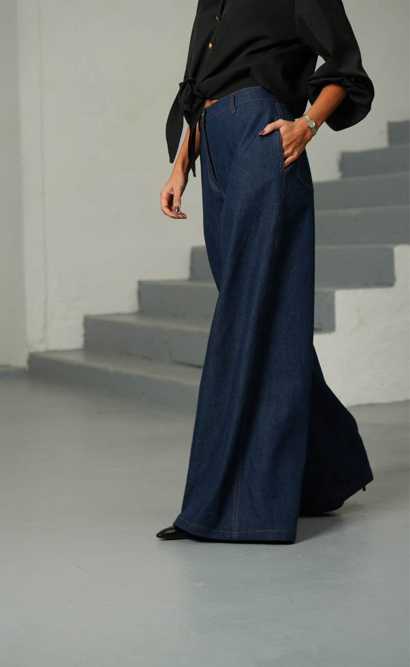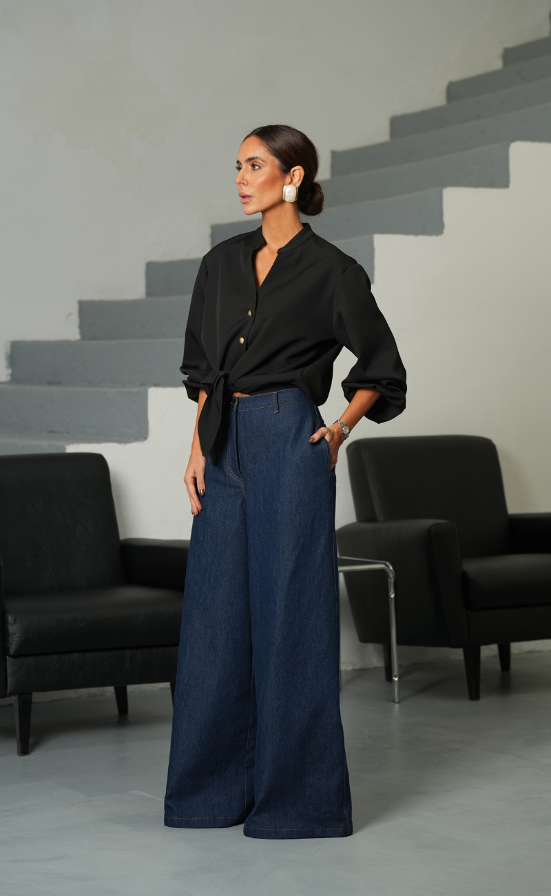 Jeans de cintura subida com bolsos. Perna larga e comprida. Fecho de correr e botão metálico à frente.