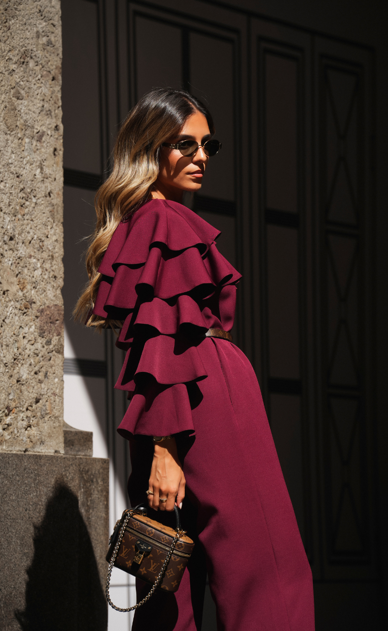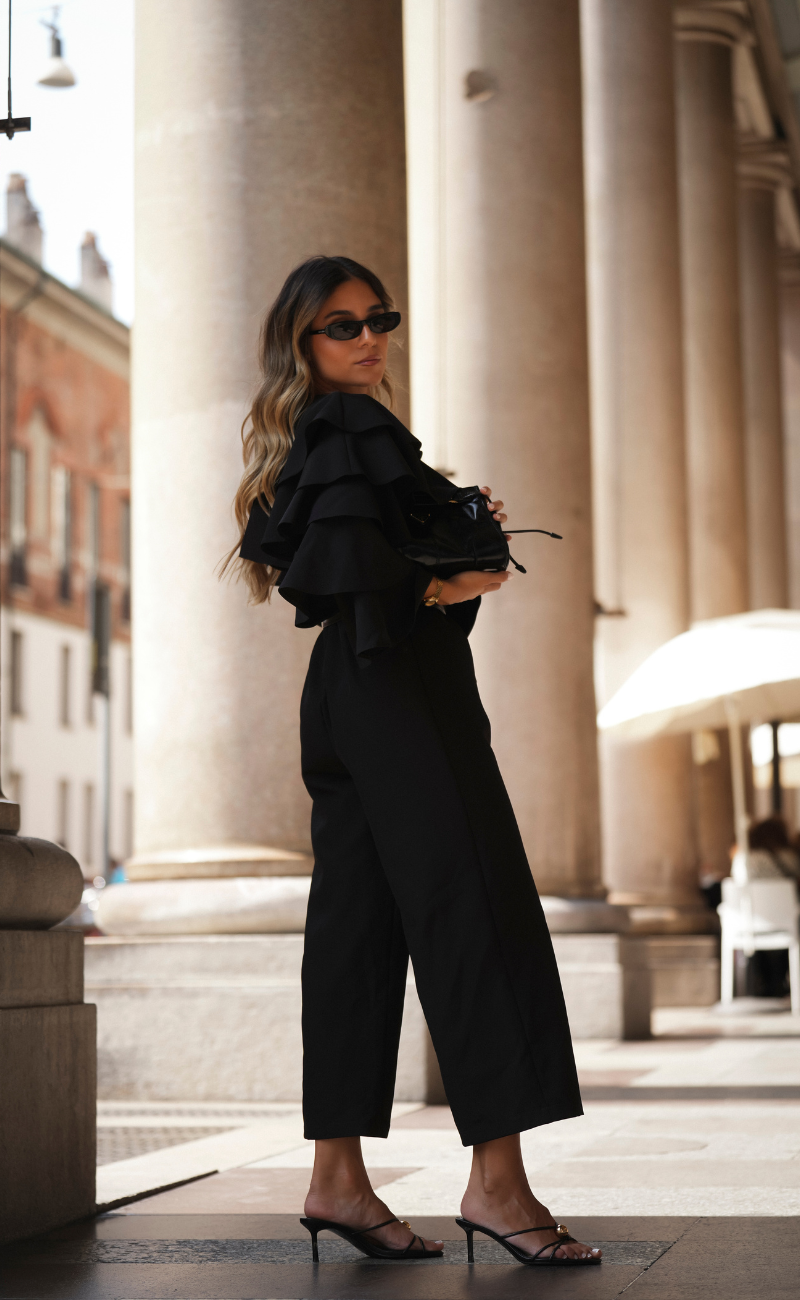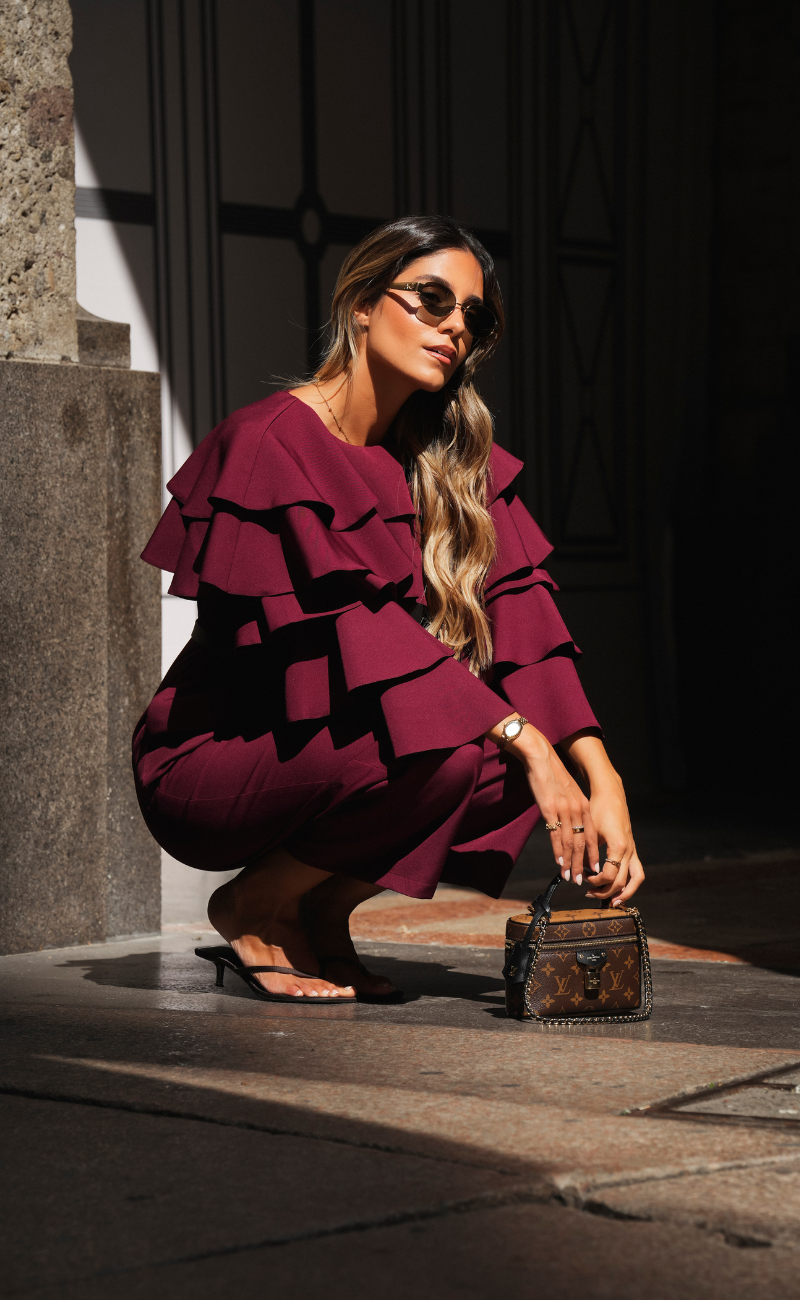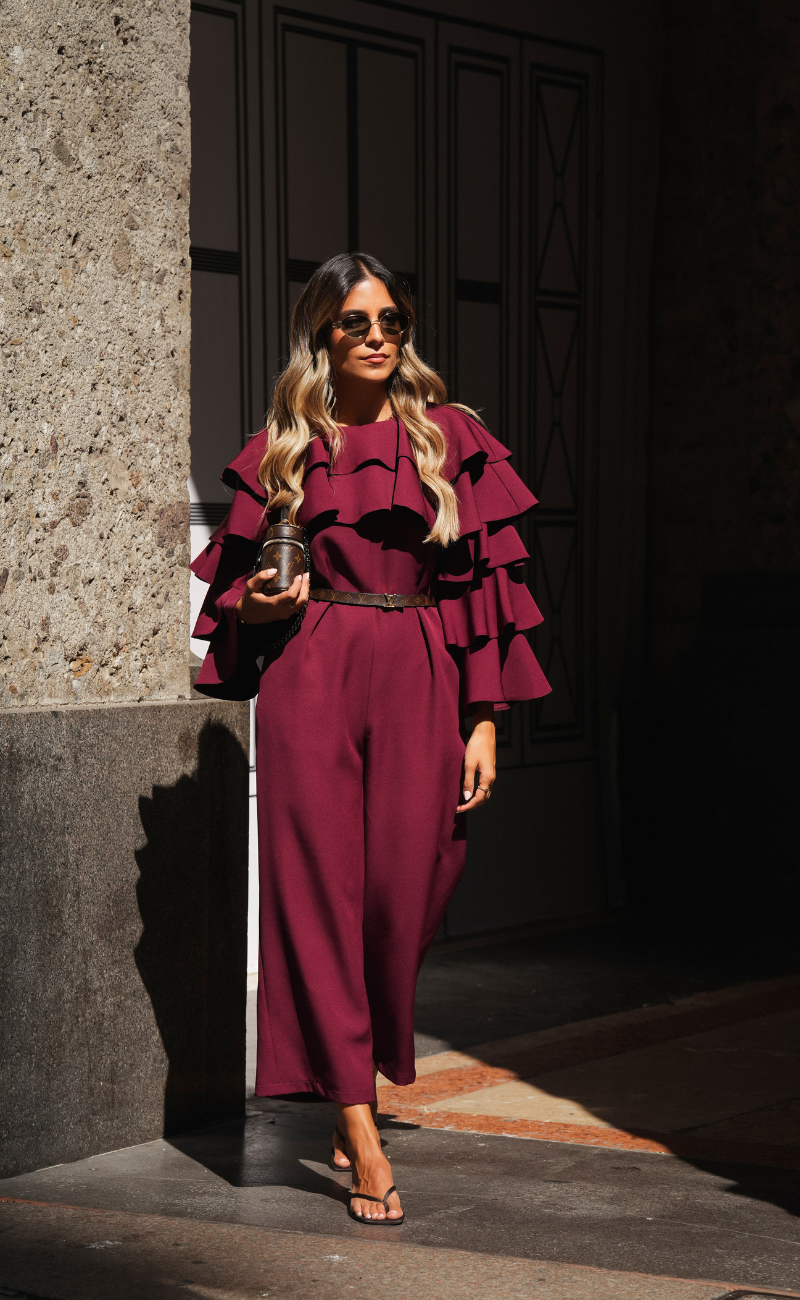 Macacão com perna cullote, larga. Decote redondo com folhos frente e costas. Manga com folhos. Fecho oculto nas costas. Bolsos.