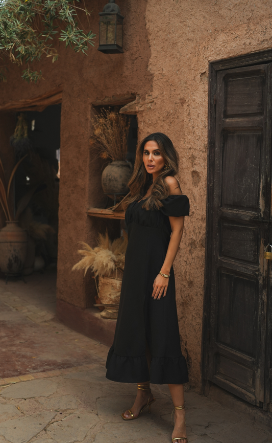 Vestido midi de decote redondo com abertura frontal e manga cava. Folho na extremidade inferior. Bolsos