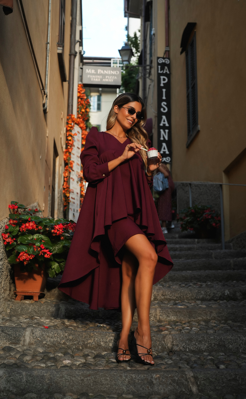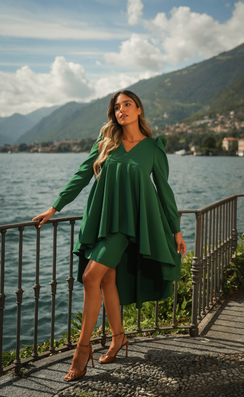 Vestido curto com decote em V e mangas compridas com detalhe de ombros marcados. Folho assimétrico. Fecho oculto nas costas.