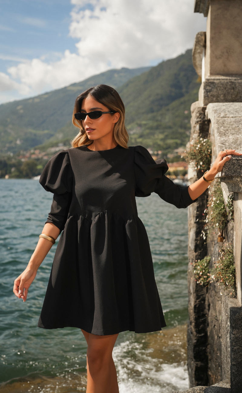 Vestido curto, com corte fluido. Decote redondo, manga comprida com detalhe de volume nos ombros. Bolsos